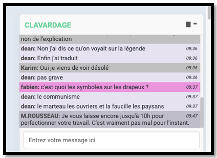 Les élèves peuvent alors remplir la feuille à plusieurs, chatter pour établir des stratégies de travail en groupe, se corriger mutuellement, demander des conseils à l’enseignant par le chat ou la visioconférence du CNED encore ouverte.