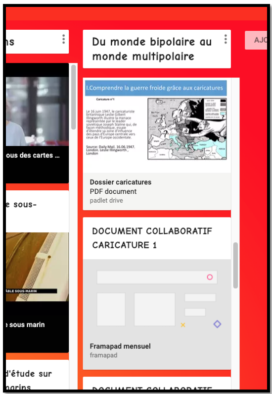 Après avoir répondu à ces questions à la maison, durant leur séance de cours à distance, les élèves sont amenés à travailler en groupe sur l’analyse d’un dessin de presse évoquant un des grands moments de la guerre froide. Ici, l’enseignant utilise padlet.com comme plateforme de dépôt des différentes ressources. Un dossier composé des dessins de presse à analyser y a été déposé.