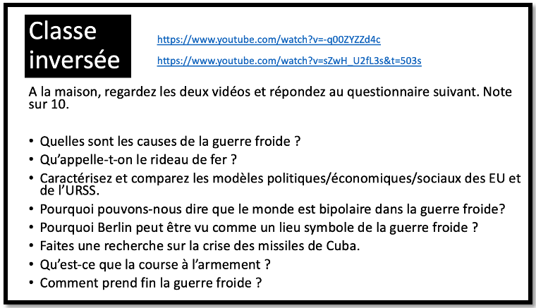 En effet, ici, les élèves ont travaillé, dans un premier temps, sur une vidéo récapitulative des grands enjeux de la guerre froide, préparée en amont par l’enseignant et assortie d’une fiche de questions reprenant les grandes idées et connaissances à maîtriser.