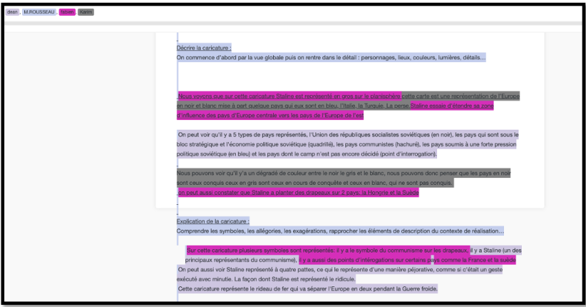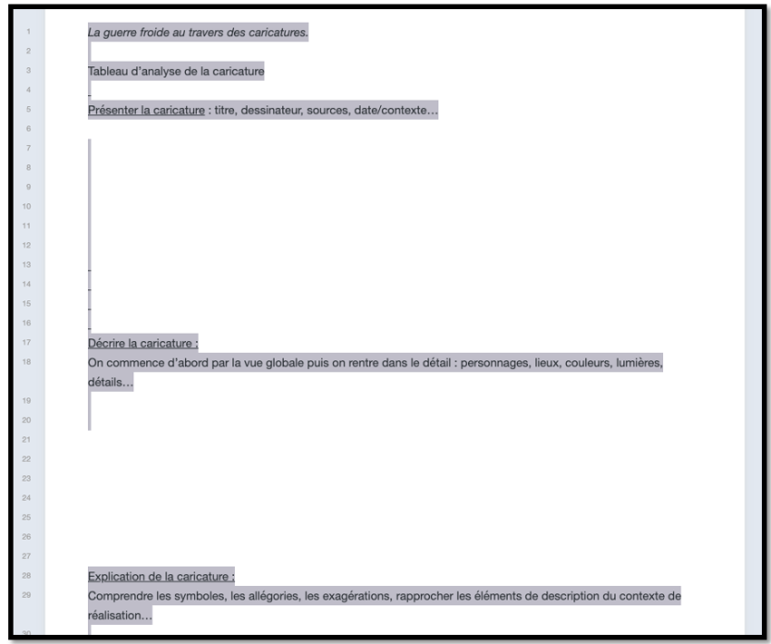 Les élèves peuvent alors ouvrir le fichier concernant leur caricature et le lien framapad sur lequel ils vont devoir travailler en groupe et remplir une page préparée par l’enseignant : « présentation, description, analyse ».