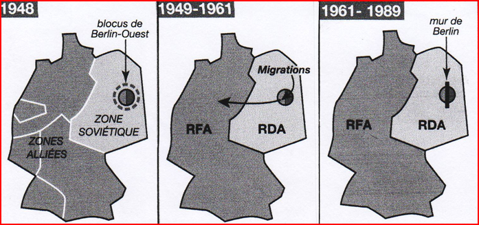 A l’aide des 3 schémas ci-dessous, les élèves sont invités, pourquoi pas au tableau, à résumer la situation de l’Allemagne et de Berlin dans la Guerre froide.