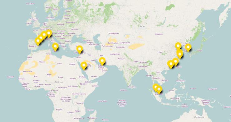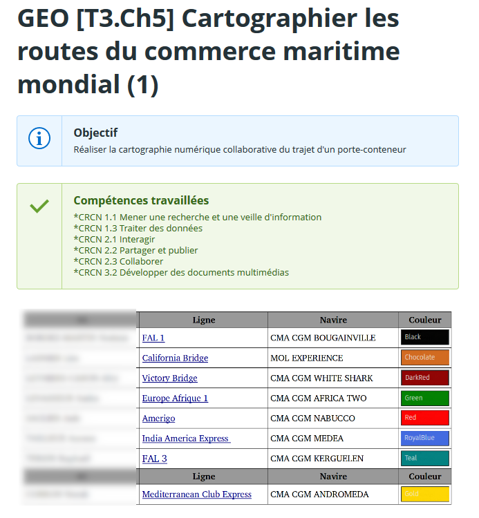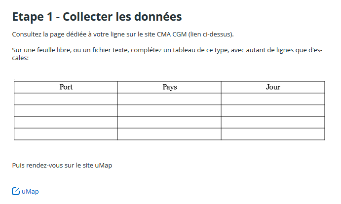 L’objectif du travail était de faire réaliser aux élèves une cartographie des principales routes commerciales de la compagnie CMA CGM, en utilisant le logiciel libre uMap qui permet de créer des cartes interactives sur des fonds OpenStreetMap (un tutoriel détaillé est accessible ici).