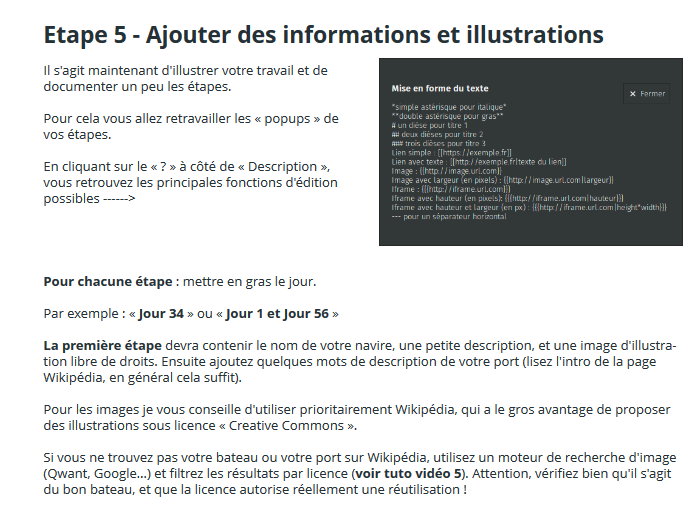 Pour cela des tutoriels rappelaient aux élèves comment trouver des images libres de droits, et comment les référencer correctement selon le type de licence.