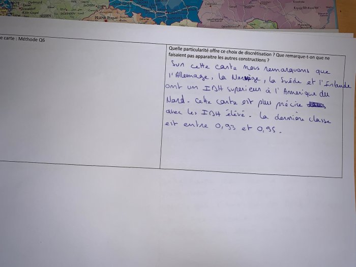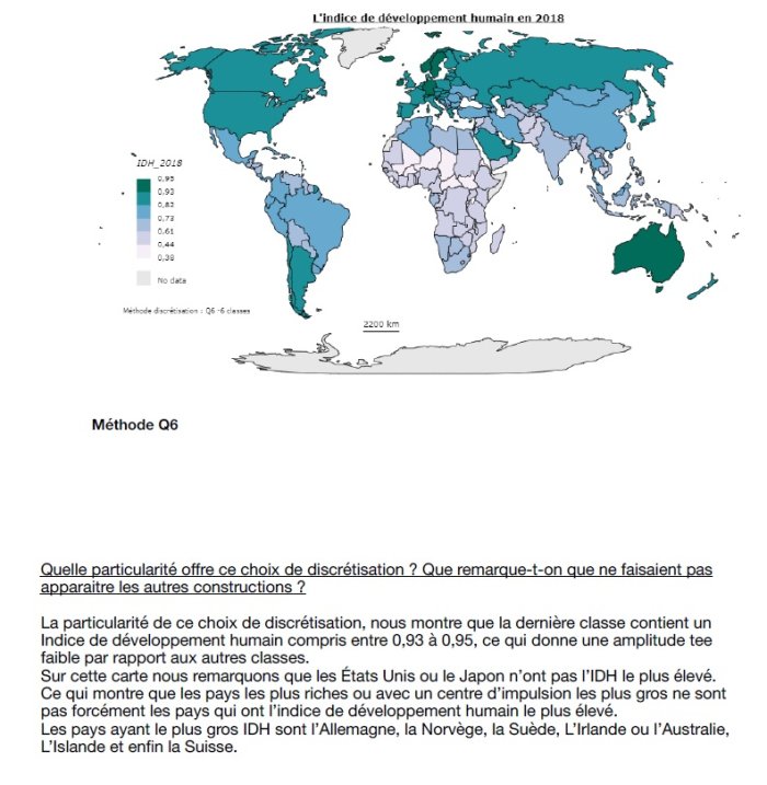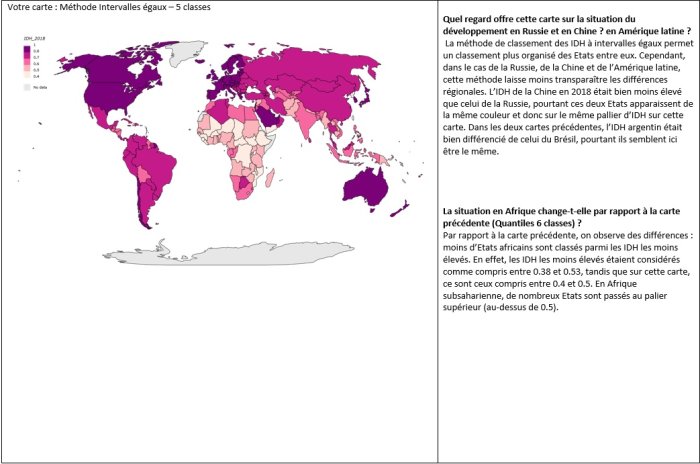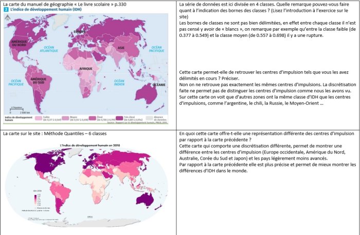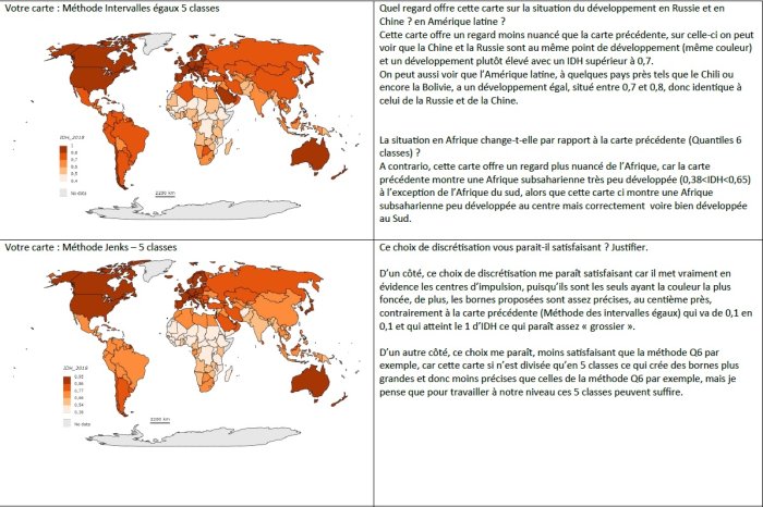 Le travail demande aux élèves de construire trois cartes avec des choix de discrétisation différents. Les trois productions sont confrontées, par le questionnaire fourni, à deux cartes références : la première est tirée du manuel de géographie de terminale « Le livre scolaire » (p. 330). Elle utilise la même source de données et propose un découpage en quatre classes.