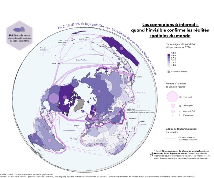 La cartographie présentée en introduction de ce numéro cible les flux internet. Le pourcentage de la population utilisant internet par pays est tiré du rapport de l’Union Internationale des Télécommunications, une agence des Nations Unies pour le Développement spécialisée dans les technologies de l’information et de la communication. Les données de 2017 ne sont pas disponibles pour tous les pays. Le choix a été fait de garder une continuité et une série homogène. Le traitement porte donc sur l’année 2016. Le tableur excel est disponible sur la page statistiques de l’agence.
