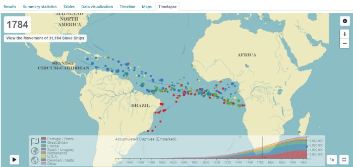 Les données utilisées proviennent en premier lieu de la base en ligne slavevoyages.org. Cette base est le fruit d’une recherche pilotée par le Emory Center for Digital Scholarship de l’Université d’Atlanta en collaboration avec le centre Hutchins de l’Université de Harvard. [1] L’objectif du projet est de rassembler les collectes de chercheurs ayant souvent travaillé de manière isolée à une époque où l’outil informatique n’était pas disponible. La première version web de Slavevoyages a été lancée en 2008. Elle a été depuis considérablement enrichie et vérifiée. Parmi les outils disponibles, il faut signaler la « Timelaps » qui permet de visualiser les mouvements de navires négriers entre les XVIe et XIXe siècles.