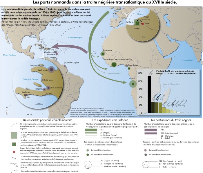 La cartographie proposée centre sur la place des ports normands dans la traite négrière transatlantique au XVIIIe siècle. La traite à partir des ports normands débute en 1660-1665 et se poursuit jusqu’en 1840 (le dernier bateau identifié ayant pratiqué la traite, pourtant illégale depuis 1815, est « Le Philanthrope »). Plus de 500 expéditions partent du complexe portuaire Le Havre-Honfleur au XVIIIe siècle (1713-1792), ce qui place les ports normands en seconde position après Nantes. Plus de 113.000 esclaves sont débarqués dans les ports de destination sur cette période selon Slavevoyages (ce chiffre couvre les expéditions renseignées, il est en réalité bien supérieur).