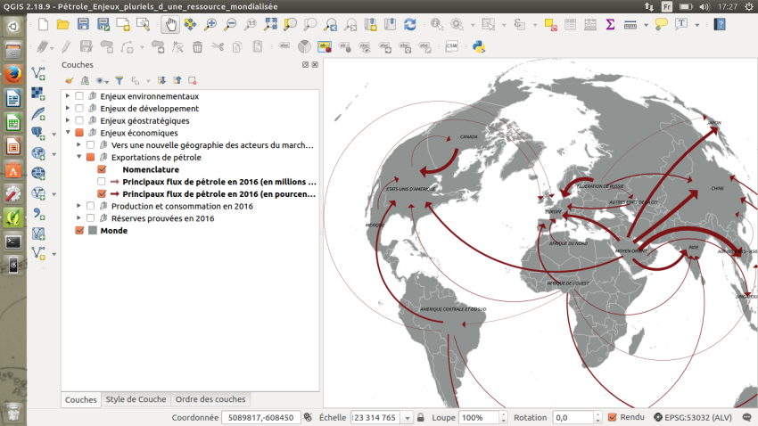 Après téléchargement des données, il suffit d’ouvrir le fichier projet intitulé Pétrole_Enjeux_pluriels_d_une_ressource_mondialisée.qgs. QGIS dans sa version 2.18.9 doit être au préalable installé [1].