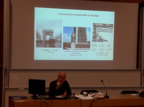 Il insiste sur l’importance des commémorations (se souvenir ensemble) ainsi que sur la nécessaire distinction entre Histoire et Mémoire. La mémoire française de la Grande Guerre est particulière puisque c’est une mémoire de vainqueur. C’est aussi une mémoire très politisée (on ne commémore que par rapport au présent). La mémoire de la Grande Guerre est particulièrement importante en cette période de centenaire (grande collecte, plus de 6000 « labellisations centenaire » accordées par la Mission du Centenaire).