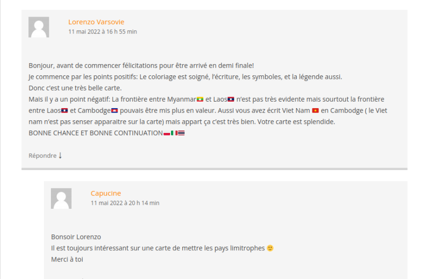 La participation de la classe à ce concours est fructueuse à bien des égards. En premier lieu, elle permet aux élèves d’intégrer les codes cartographiques à travers la pratique quasi hebdomadaire de l’évaluation et, surtout, du commentaire d’une carte. Par ailleurs, la lecture des commentaires formulés par les autres élèves est l’occasion de prendre conscience de certaines de ses erreurs et de s’améliorer. Ces mêmes commentaires sont même à l’origine d’échanges entre commentateurs et concepteurs de la carte :