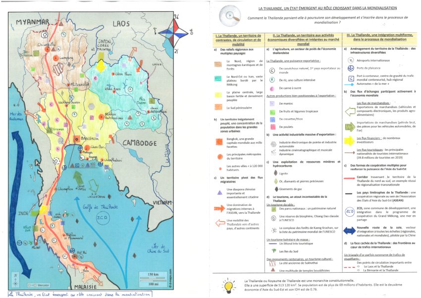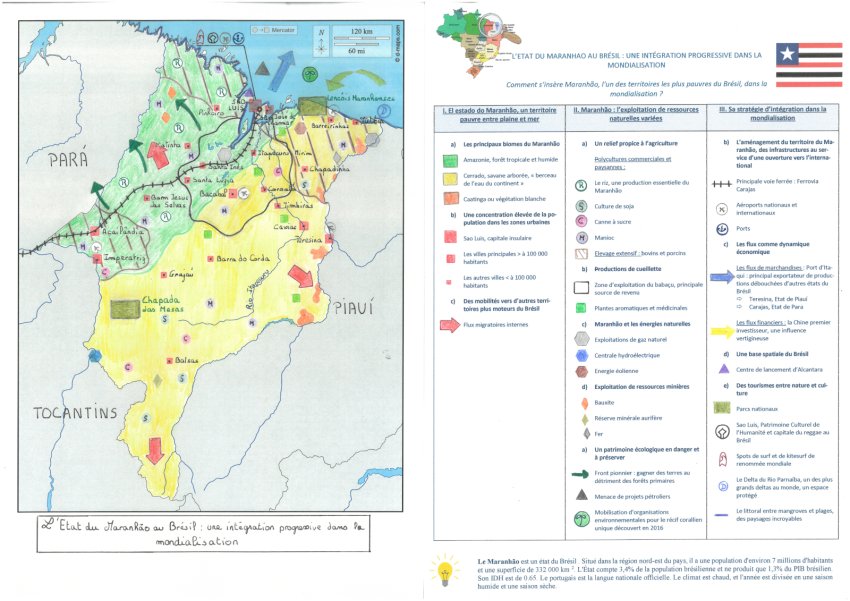 Le travail de recherche documentaire nécessaire à la réalisation des cartes s’accompagne par ailleurs d’une fréquentation accrue de cartes « extra-scolaires ». Les apprentis cartographes ne travaillent plus seulement sur les cartes du manuel ou celles produites par leur professeur. Les atlas, les magazines spécialisés comme Carto sont l’occasion de découvrir de nouvelles astuces cartographiques et de les mettre en œuvre. Pour ne donner qu’un exemple, les élèves du Havre 4 se sont heurtés à la représentation des différentes caractéristiques des métropoles. Ils ont choisi de placer, en léger retrait, sur une même ligne les figurés qui les illustrent. Ces figurés sont en général des pictogrammes. Ce procédé est notamment mobilisé pour réaliser les cartes du Maranhão (quart de finale) et de la Thaïlande (demi-finale). Cette astuce vise à rendre la carte plus lisible. Ni le manuel de Géographie ni leur professeur ne recourent à celle-ci…